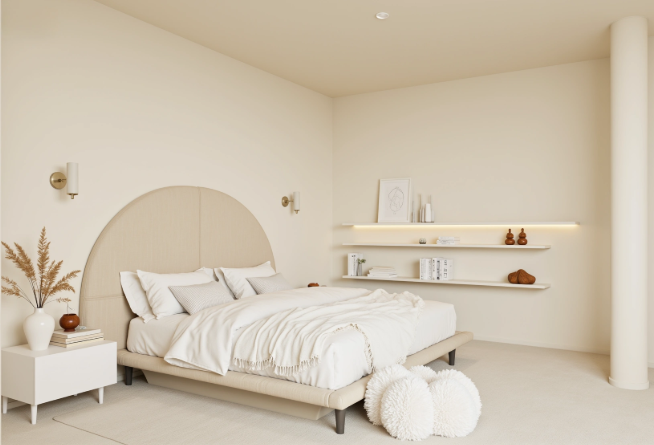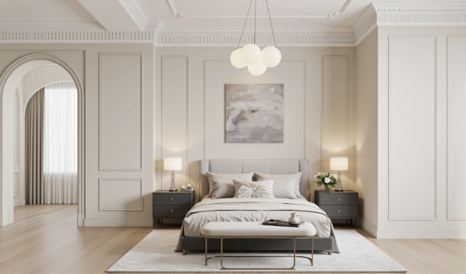 This bedroom features a soft cream textured paint on the walls, with a delicate and soft touch, creating a gentle and healing atmosphere. The soft cream walls are paired with a spherical pendant light and a decorative painting, while the bedding uses a soft knitted material, creating a comfortable, relaxing, and healing bedroom atmosphere.