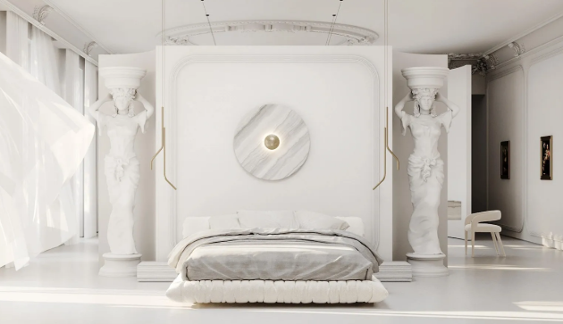 The headboard wall in this bedroom features a delicate white plaster border, with a circular marble-patterned decoration in the center. Symmetrically placed white classical goddess sculptures on either side create an ethereal yet dignified atmosphere. The plaster carvings on the ceiling and the draped white gauze curtains continue the classical elegance. The entire bedroom design, through the goddess sculptures, perfectly balances the ritualistic feel of classical art with the relaxed feel of modern minimalism.