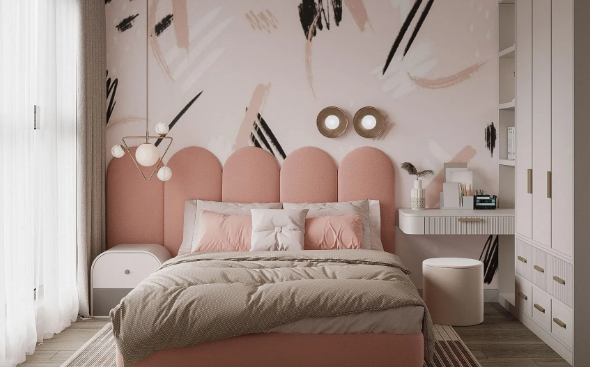 This bedroom uses soft pink and off-white as its core color scheme. The curved upholstered headboard and abstract art wallpaper are the visual focal points, complemented by light gray polka-dot bedding and pink and white contrasting cushions, creating a soft and comfortable feel. The background wall uses abstract art wallpaper, with casual lines in contrasting pink, black, and white injecting personality and artistic flair. Geometric pendant lights and metal wall lamps add a touch of sophistication with modern metallic elements, satisfying both a girlish romanticism and the clean lines and high-end feel of modern home decor.