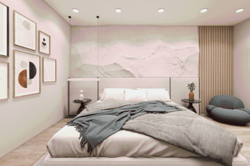 The walls of this bedroom are rendered using 3D rendering technology, with a soft pink as the main color. Artworks with unique textures and geometric patterns adorn the space, creating an artistic atmosphere. The right side of the wall features vertically grained wood panels, complementing the 3D rendered wall design and adding depth and dimension to the bedroom.
