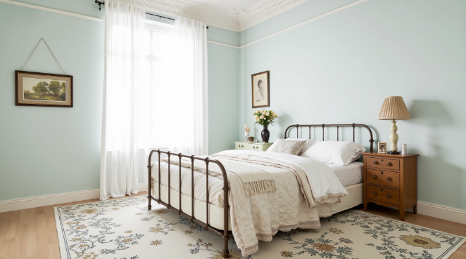 This bedroom uses soft mint green walls as a base, paired with warm wood and vintage metal elements, creating a tranquil and serene atmosphere with a touch of retro charm. The black wrought iron bed frame has clean, simple lines, carrying the classic temperament of English retro style. The mint green walls and a large floral patterned rug inject a romantic, pastoral vitality into the space. The entire bedroom design perfectly blends fresh romance with retro elegance.