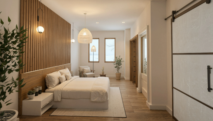 This bedroom features a vertical wooden slatted background wall, paired with a headboard of the same material. The natural wood grain is clearly visible, conveying a warm and rustic natural feel, echoing the light wood flooring. Spherical glass wall lamps and paper rattan pendant lights illuminate the space with soft, warm light, avoiding harsh glare and creating a tranquil and healing resting space.